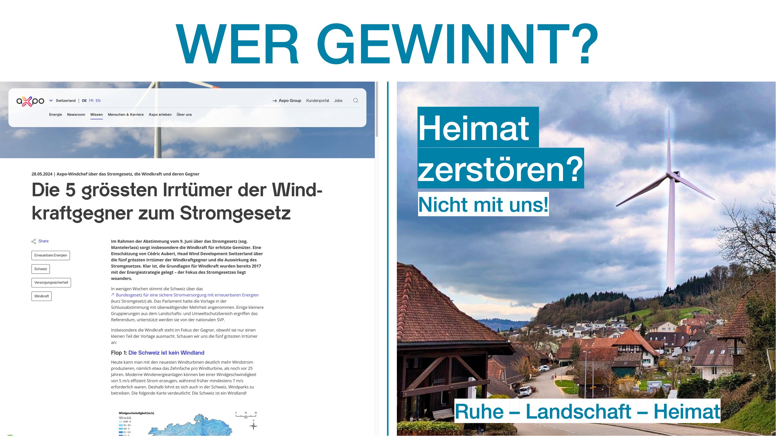 Axpo, grosser Energieversorger der Schweiz, antwortet mit einem Artikel über die "5 grössten Irrtümer der Windkraftgegner." Nummeriert und sachlich. Cédric Aubert, Head Wind Development Switzerland, als anonymer Experte ohne persönliche Geschichte. Der Artikel ist korrekt aber wer soll das lesen? Er erreicht niemanden, der nicht bereits überzeugt ist oder damit sein Geld verdient.