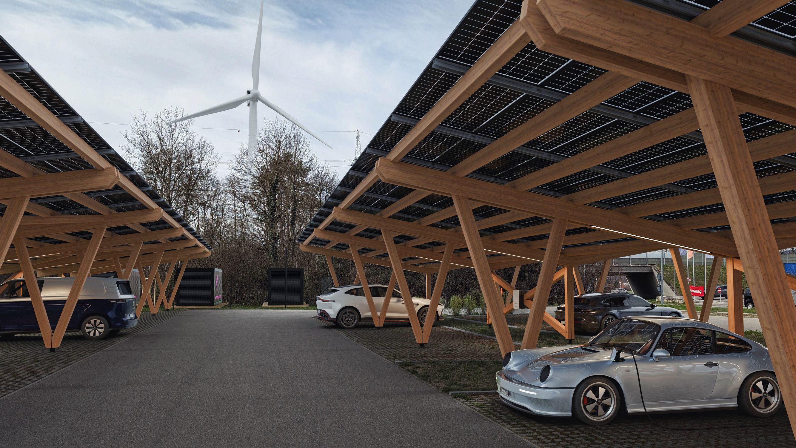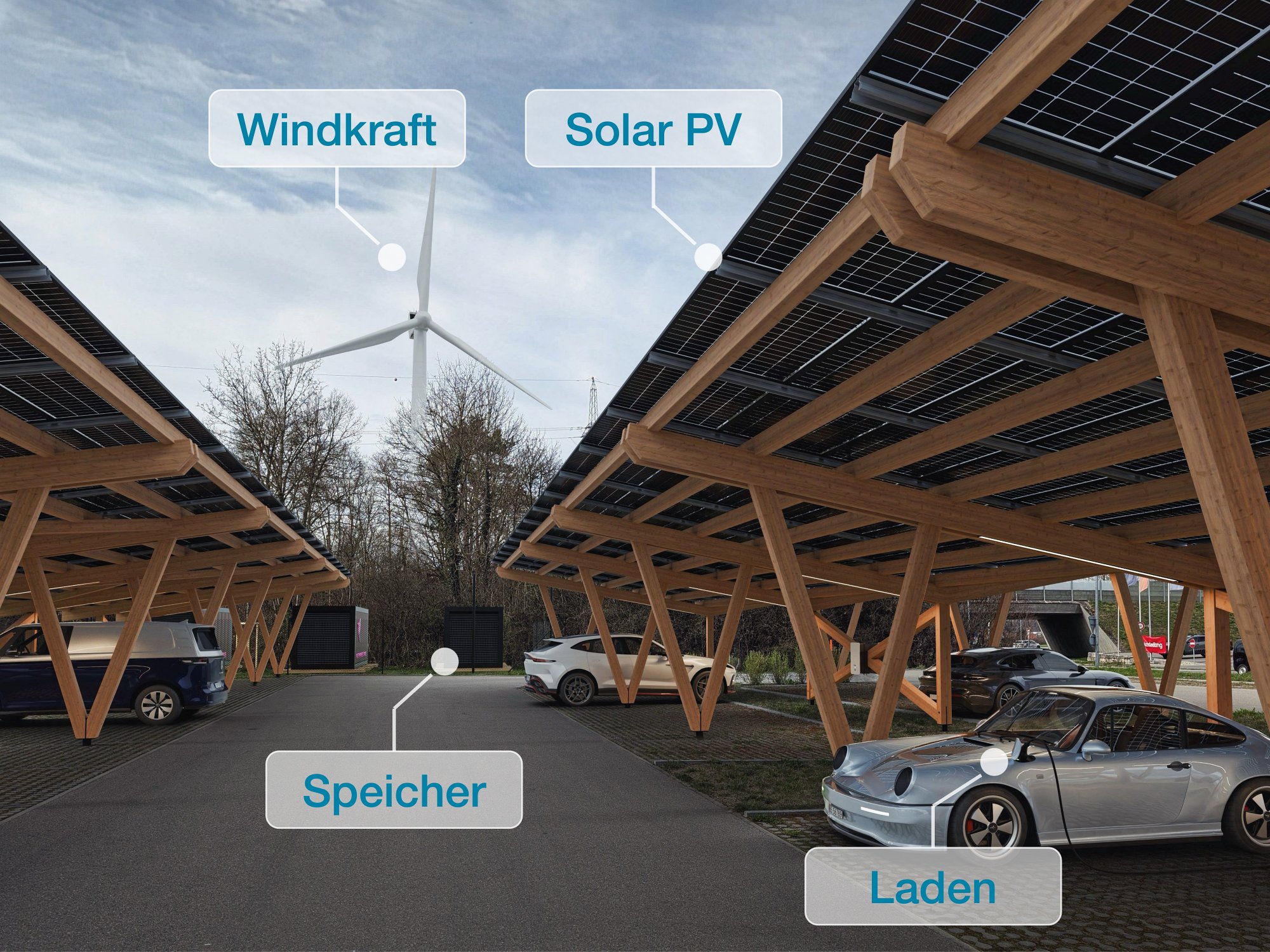 Aber da ist noch der Parkplatz. Der Solar Port verdoppelt die installierbare PV-Leistung. Der starke Netzanschluss erlaubt den Einsatz grosser Speicher.