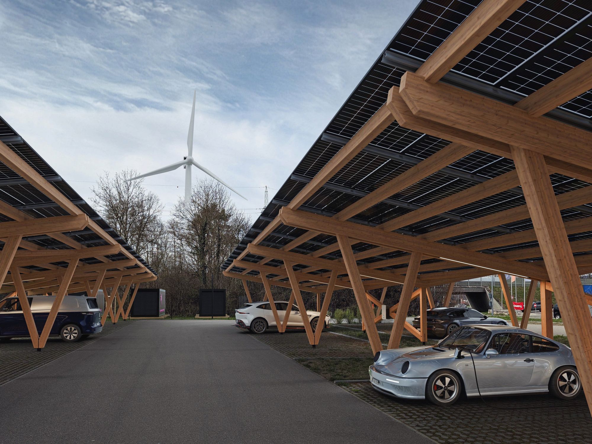 Ein elektrischer Porsche 911, ein Solar Carport aus Holz und eine Rechnung, die überrascht.